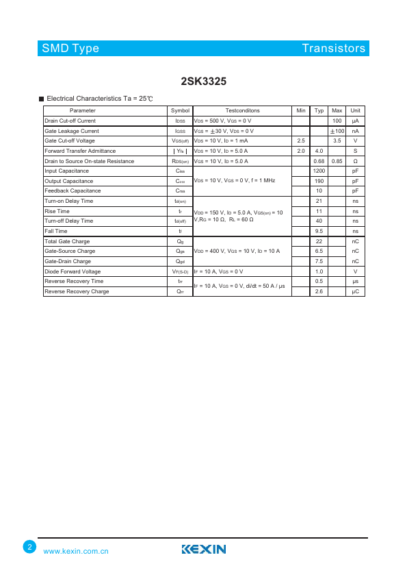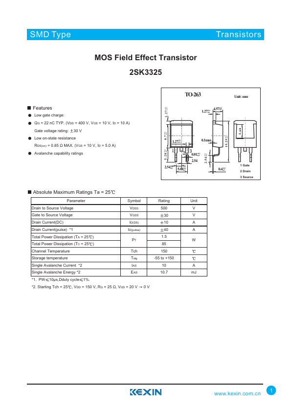 Low gate charge: QG = 22 nC TYP. (VDD = 400 V, VGS = 10 V, ID = 10 A) Gate voltage rating: 30 V Low on-state resistance RDS(on) = 0.85 Ù MAX. (VGS = 10 V, ID = 5.0 A) Avalanche capability ratings