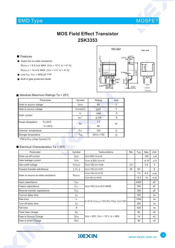 Super low on-state resistance: RDS(on)1 = 9.5 m MAX. (VGS = 10 V, ID = 41 A) RDS(on)2 = 14 m MAX. (VGS = 4 V, ID = 41 A) Low Ciss: Ciss = 4650 pF TYP. Built-in gate protection diode