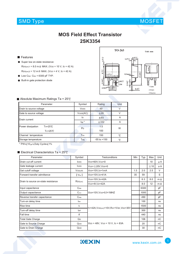 Super low on-state resistance: RDS(on)1 = 8.0 m MAX. (VGS = 10 V, ID = 42 A) RDS(on)2 = 12 m MAX. (VGS = 4 V, ID = 42 A) Low Ciss: Ciss = 6300 pF TYP. Built-in gate protection diode