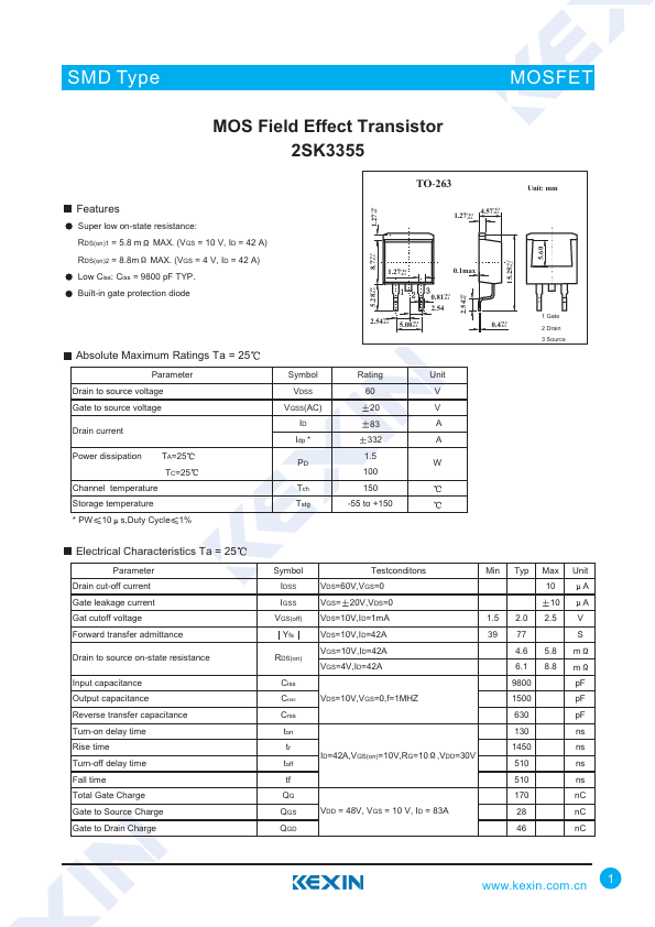 Super low on-state resistance: RDS(on)1 = 5.8 m MAX. (VGS = 10 V, ID = 42 A) RDS(on)2 = 8.8m MAX. (VGS = 4 V, ID = 42 A) Low Ciss: Ciss = 9800 pF TYP. Built-in gate protection diode