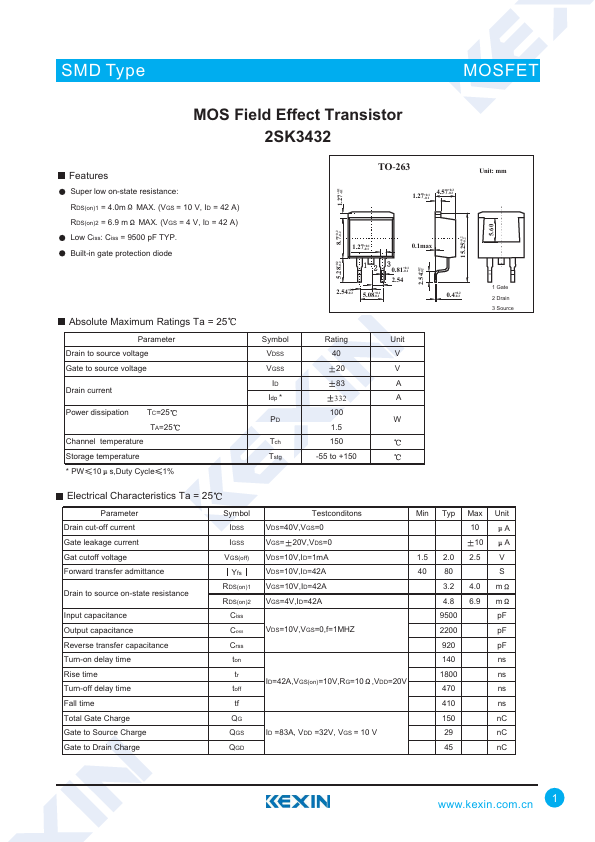 Super low on-state resistance: RDS(on)1 = 4.0m MAX. (VGS = 10 V, ID = 42 A) RDS(on)2 = 6.9 m MAX. (VGS = 4 V, ID = 42 A) Low Ciss: Ciss = 9500 pF TYP. Built-in gate protection diode