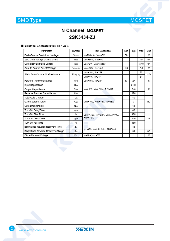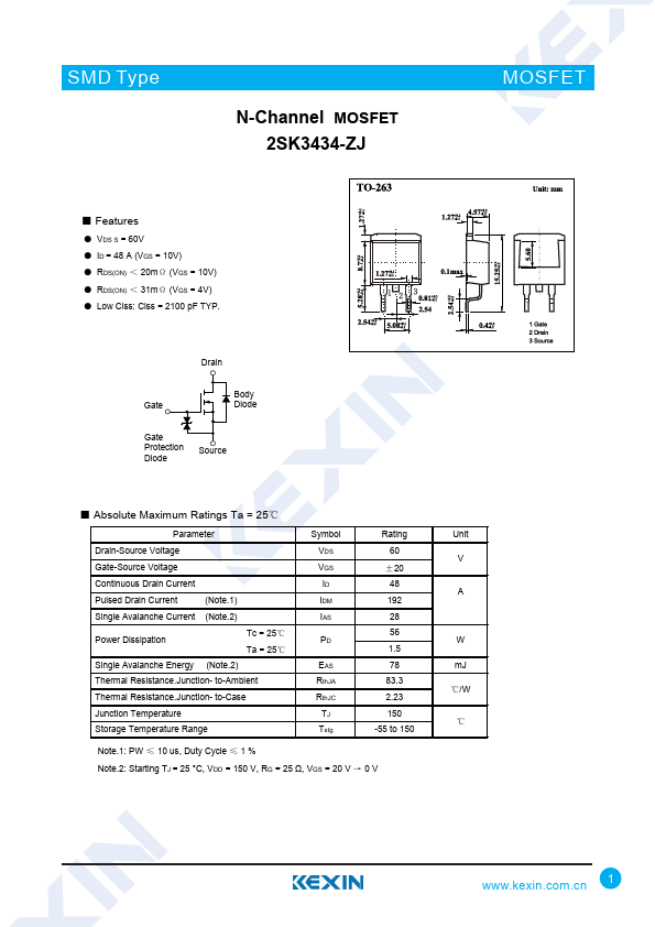 ● VDS S = 60V ● ID = 48 A (VGS = 10V) ● RDS(ON) < 20mΩ (VGS = 10V) ● RDS(ON) < 31mΩ (VGS = 4V) ● Low Ciss: Ciss = 2100 pF TYP.