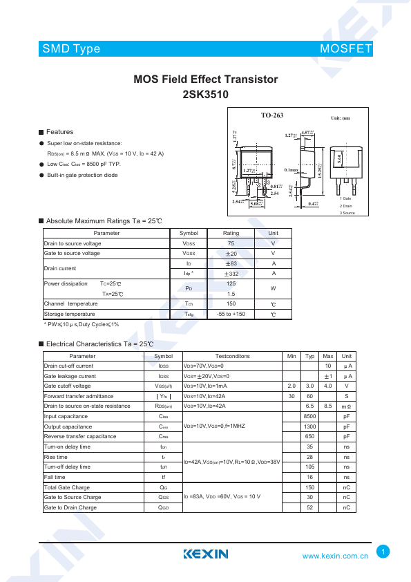Super low on-state resistance: RDS(on) = 8.5 m MAX. (VGS = 10 V, ID = 42 A) Low Ciss: Ciss = 8500 pF TYP. Built-in gate protection diode