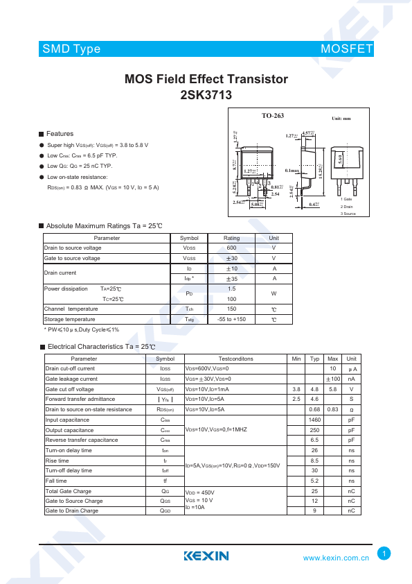 Super high VGS(off): VGS(off) = 3.8 to 5.8 V Low Crss: Crss = 6.5 pF TYP. Low QG: QG = 25 nC TYP. Low on-state resistance: RDS(on) = 0.83 MAX. (VGS = 10 V, ID = 5 A)