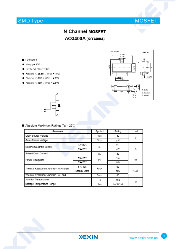 ● VDS (V) = 30V ● ID = 5.7 A (VGS = 10V) ● RDS(ON) < 26.5mΩ (VGS = 10V) ● RDS(ON) < 32mΩ (VGS = 4.5V) ● RDS(ON) < 48mΩ (VGS = 2.5V)