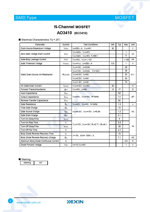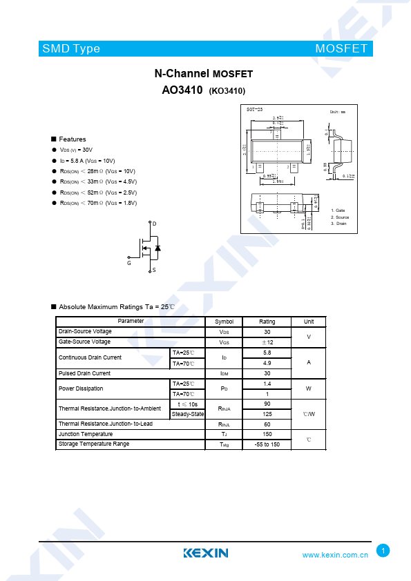 ● VDS (V) = 30V ● ID = 5.8 A (VGS = 10V) ● RDS(ON) < 28mΩ (VGS = 10V) ● RDS(ON) < 33mΩ (VGS = 4.5V) ● RDS(ON) < 52mΩ (VGS = 2.5V) ● RDS(ON) < 70mΩ (VGS = 1.8V)