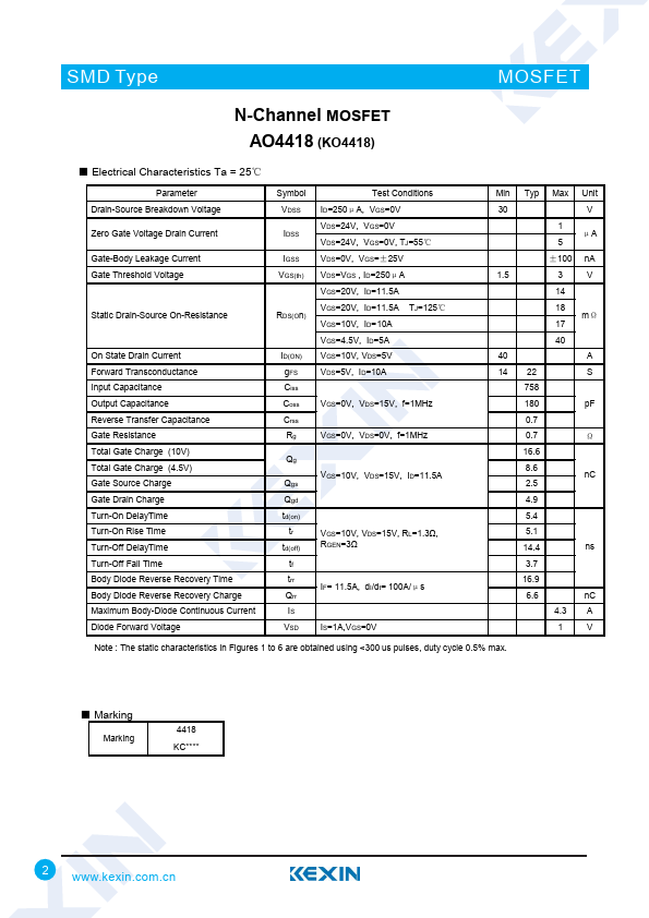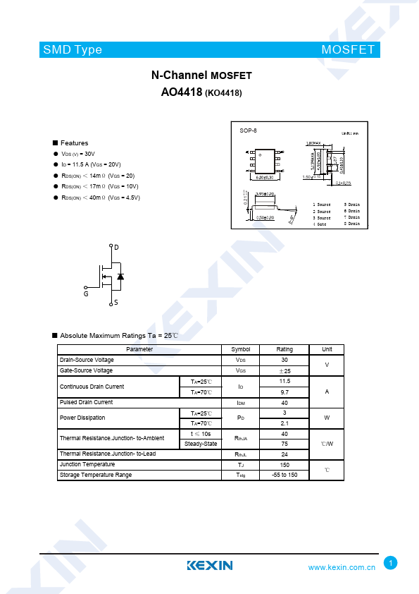 ● VDS (V) = 30V ● ID = 11.5 A (VGS = 20V) ● RDS(ON) < 14mΩ (VGS = 20) ● RDS(ON) < 17mΩ (VGS = 10V) ● RDS(ON) < 40mΩ (VGS = 4.5V)