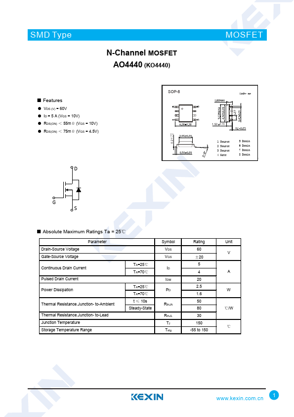● VDS (V) = 60V ● ID = 5 A (VGS = 10V) ● RDS(ON) < 55mΩ (VGS = 10V) ● RDS(ON) < 75mΩ (VGS = 4.5V)