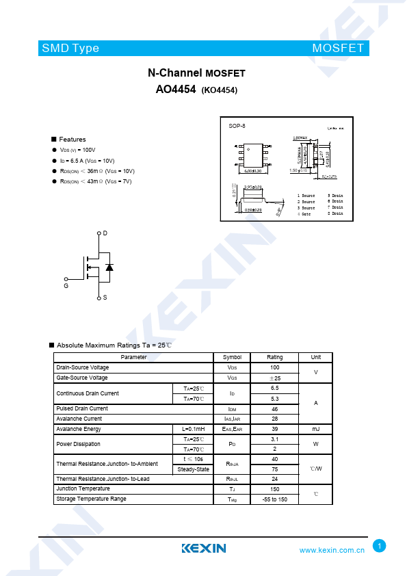 ● VDS (V) = 100V ● ID = 6.5 A (VGS = 10V) ● RDS(ON) < 36mΩ (VGS = 10V) ● RDS(ON) < 43mΩ (VGS = 7V)