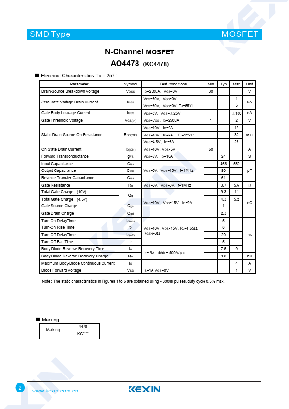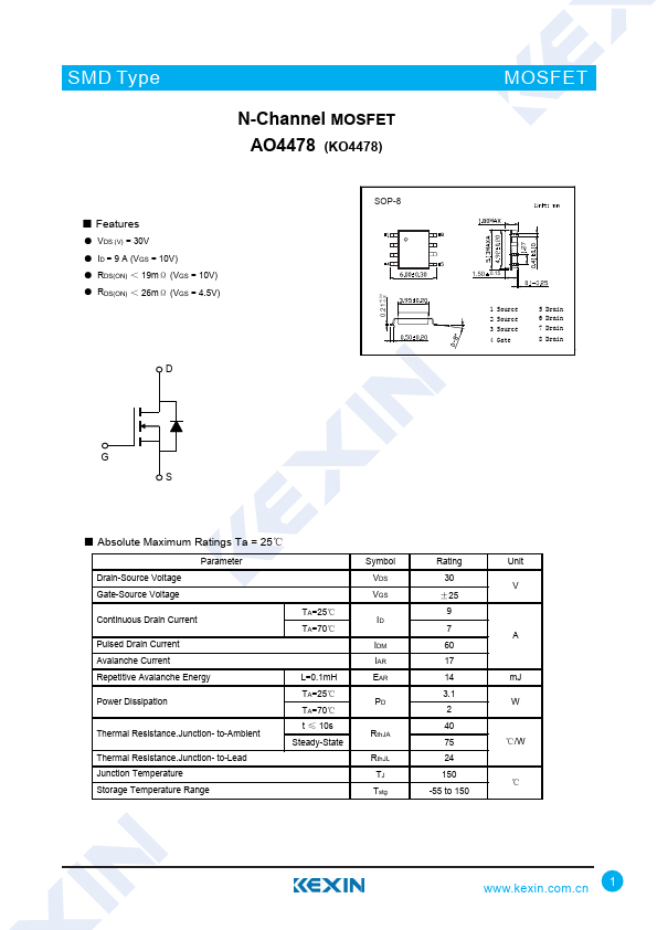 ● VDS (V) = 30V ● ID = 9 A (VGS = 10V) ● RDS(ON) < 19mΩ (VGS = 10V) ● RDS(ON) < 26mΩ (VGS = 4.5V)