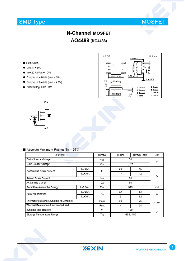 ● VDS (V) = 30V ● ID = 20 A (VGS = 10V) ● RDS(ON) < 4.6mΩ (VGS = 10V) ● RDS(ON) < 6.4mΩ (VGS = 4.5V) ● ESD Rating: 2KV HBM