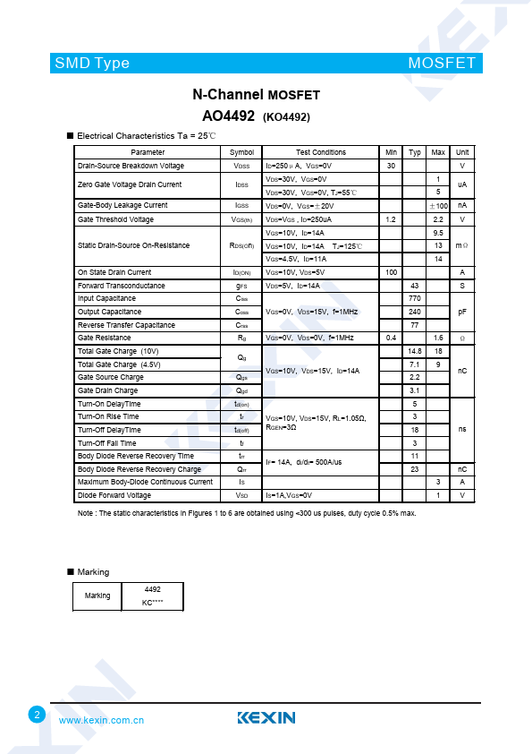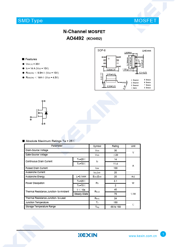 ● VDS (V) = 30V ● ID = 14 A (VGS = 10V) ● RDS(ON) < 9.5mΩ (VGS = 10V) ● RDS(ON) < 14mΩ (VGS = 4.5V)