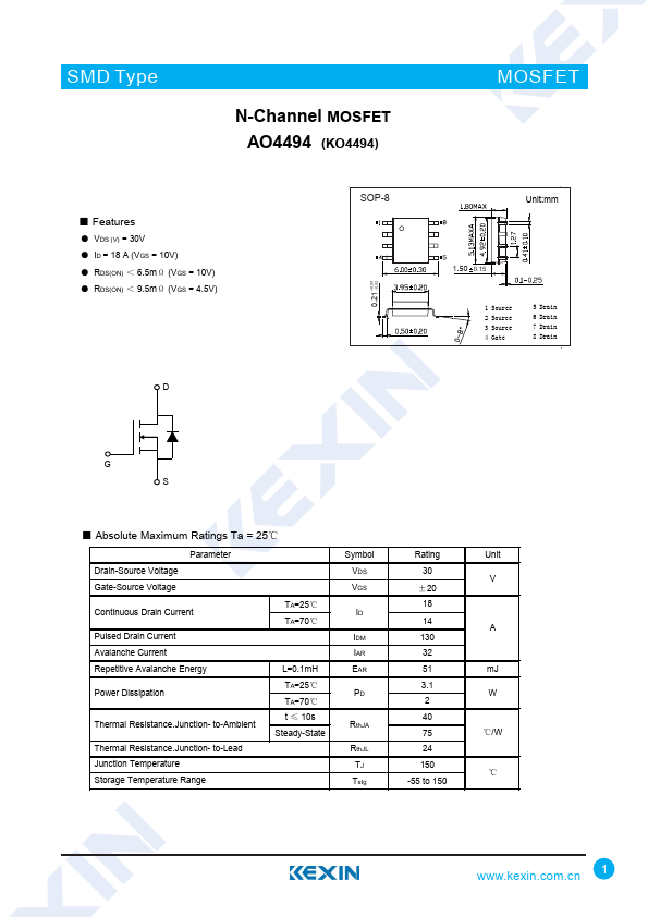 ● VDS (V) = 30V ● ID = 18 A (VGS = 10V) ● RDS(ON) < 6.5mΩ (VGS = 10V) ● RDS(ON) < 9.5mΩ (VGS = 4.5V)