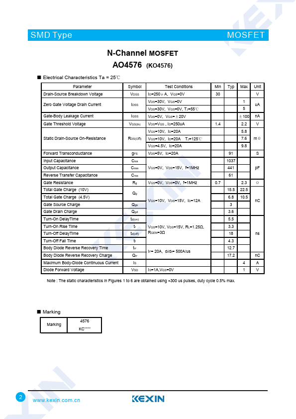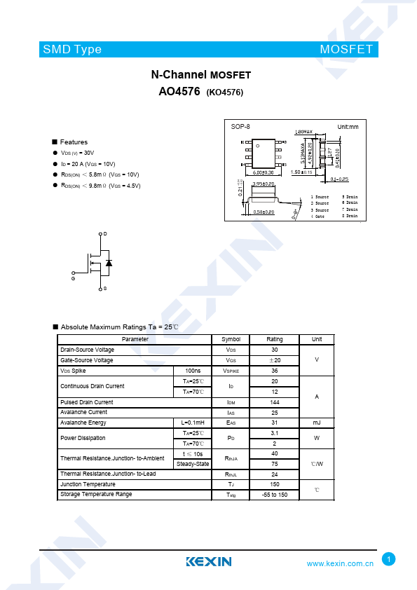 ● VDS (V) = 30V ● ID = 20 A (VGS = 10V) ● RDS(ON) < 5.8mΩ (VGS = 10V) ● RDS(ON) < 9.8mΩ (VGS = 4.5V)