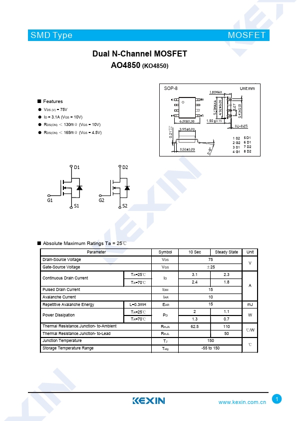 Dual N-Channel MOSFET AO4850 (KO4850)