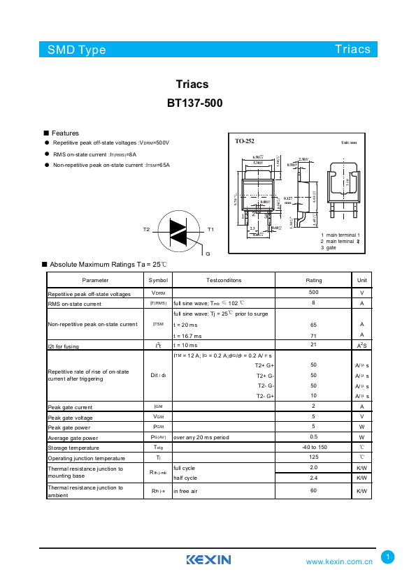 ● Repetitive peak off-state voltages :VDRM=500V ● RMS on-state current :IT(RMS)=8A ● Non-repetitive peak on-state current :ITSM=65A