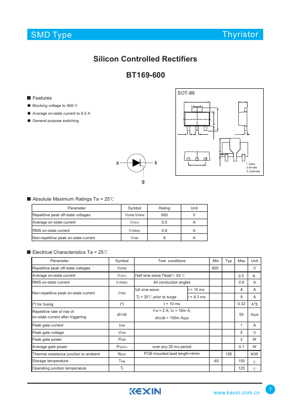 ● Blocking voltage to 600 V ● Average on-state current to 0.5 A ● General purpose switching