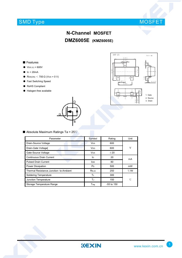 ƽ VDS (V) = 600V ƽ ID = 20mA ƽ RDS(ON) ˘ 700 ȍ (VGS = 0 V) ƽ Fast Switching Speed ƽ RoHS Compliant ƽ Halogen-free available