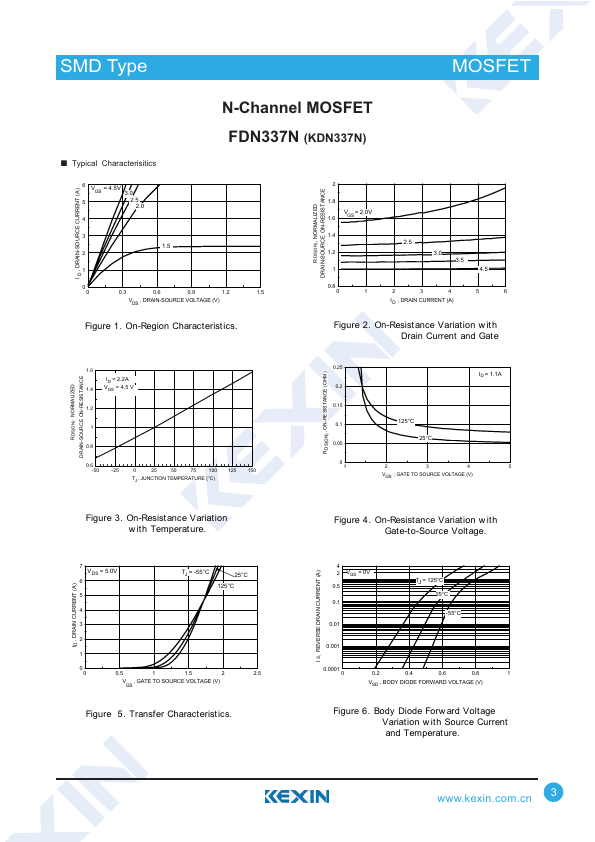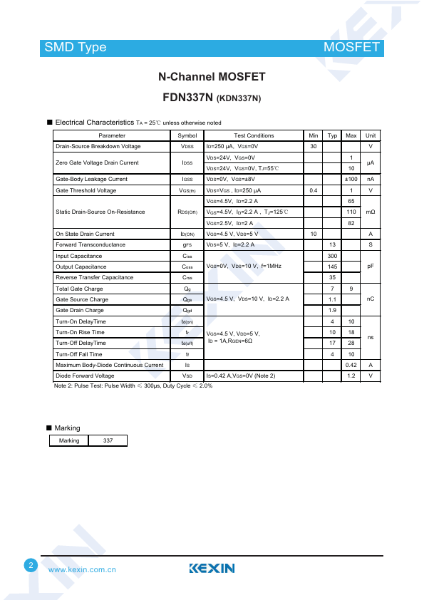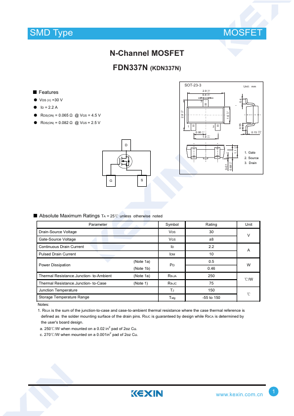SMD Type N-Channel MOSFET FDN337N (KDN337N) TraMnOsiSsFtoErsT Ƶ Features ƽ VDS (V) =30 V ƽ ID = 2.2 A ƽ RDS(ON) = 0.065 ȍ @ VGS = 4.5 V ƽ RDS(ON) = 0.082 ȍ @ VGS = 2.5 V D +0.2 2.8 -0.1 SOT-23-3 2.9 +0.2 -0.1 0.4 +0.1 -0.1 3 1 2 0.95 +0.1 -0.1 1.9 +0.1 -0.2 +0.2 1.6 -0.1 +0.2 1.1 -0.1 0.55 0.4 Unit : mm 0.15 +0.02 -0.02 1. Gate 2. Source 3. Drain 0-0.1 +0.1 0.68 -0.1 G S Ƶ Absolute Maximum Ratings TA = 25ć unless otherwise noted Drain-Source Voltage Gate-Source Voltage Parameter Symbol Rating Unit VDS 30 V VGS ±8 Continuous Drain Current Pulsed Drain Current ID 2.2 A IDM 10 Power Dissipation (Note 1a) PD (Note 1b) 0.5 W 0.46 Thermal Resistance.Junction- to-Ambient Thermal Resistance.