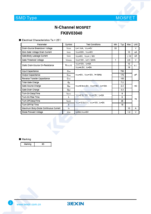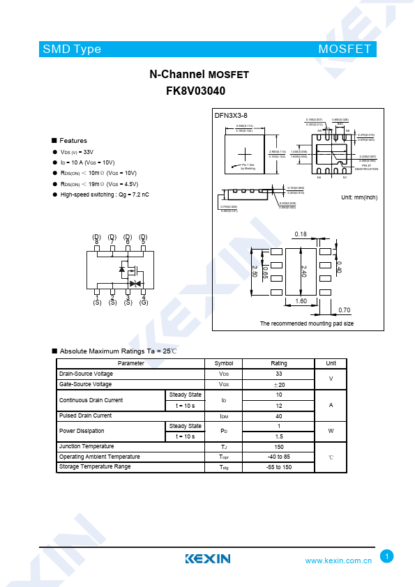 ● VDS (V) = 33V ● ID = 10 A (VGS = 10V) ● RDS(ON) < 10mΩ (VGS = 10V) ● RDS(ON) < 19mΩ (VGS = 4.5V) ● High-speed switching : Qg = 7.2 nC