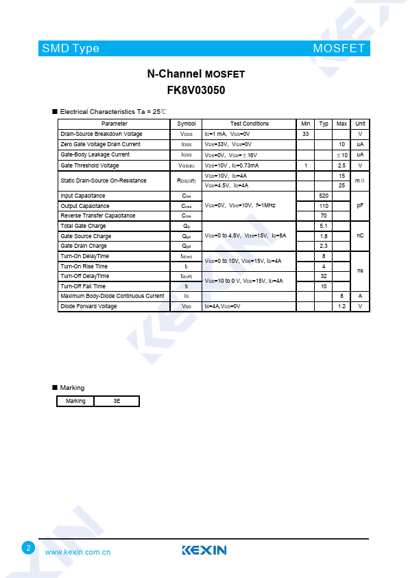 ● VDS (V) = 33V ● ID = 8 A (VGS = 10V) ● RDS(ON) < 15mΩ (VGS = 10V) ● RDS(ON) < 25mΩ (VGS = 4.5V) ● High-speed switching : Qg = 5.1 nC