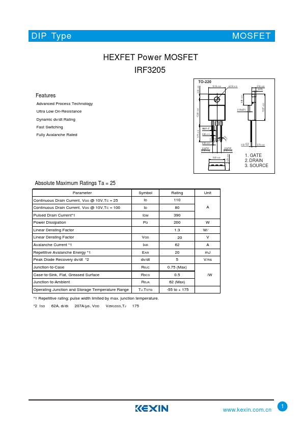 Advanced Process Technology Ultra Low On-Resistance Dynamic dv/dt Rating Fast Switching Fully Avalanche Rated