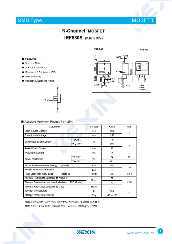 ● VDS (V) = 500V ● ID = 4.5 A (VGS = 10V) ● RDS(ON) < 1.5Ω (VGS = 10V) ● Fast Switching ● Repetitive Avalanche Rated