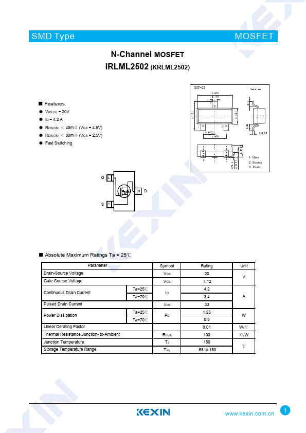 N-Channel MOSFET IRLML2502 (KRLML2502)