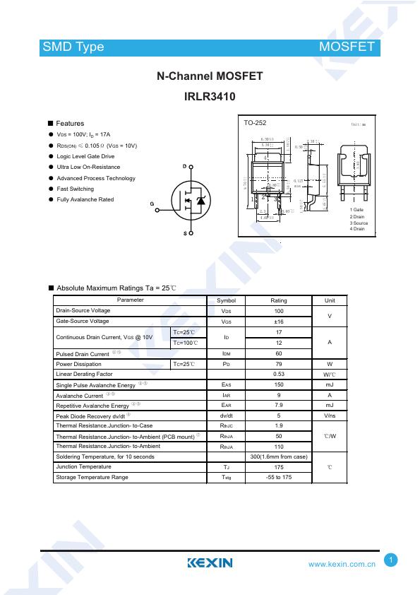 ƽ VDS = 100V; ID = 17A ƽ RDS(ON) İ 0.105¡ (VGS = 10V) ƽ Logic Level Gate Drive ƽ Ultra Low On-Resistance ƽ Advanced Process Technology ƽ Fast Switching ƽ Fully Avalanche Rated