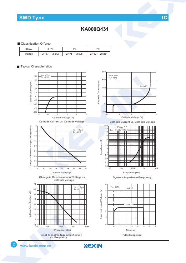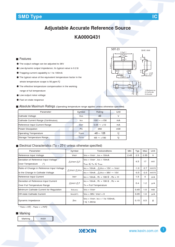The output voltage can be adjusted to 36V Low dynamic output impedance, its typical value is 0.2 Trapping current capability is 1 to 100mA The typical value of the equivalent temperature factor in the whole temperature scope is 50 ppm/ The effective temperature compensation in the working range of full temperature Low output noise voltage Fast on-state response