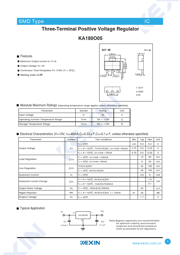 Maximum Output current IO: 0.1A Output Voltage VO: 5V Continuous Total Dissipation PD: 0.5W (Ta = 25 ) ƽ Marking Code: KL