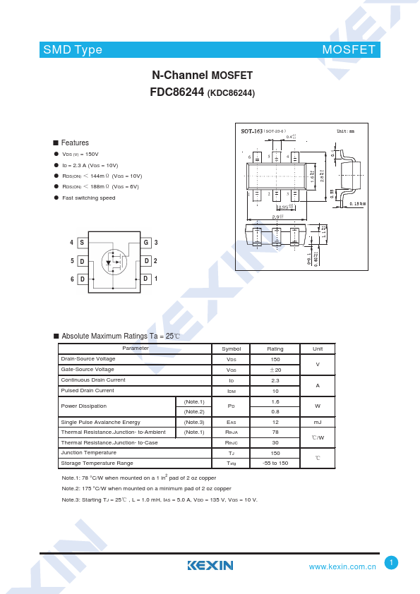 SMD Type N-Channel MOSFET FDC86244 (KDC86244) MOSFET Ƶ Features ƽ VDS (V) = 150V ƽ ID = 2.3 A (VGS = 10V) ƽ RDS(ON) ˘ 144m¡ (VGS = 10V) ƽ RDS(ON) ˘ 188m¡ (VGS = 6V) ƽ Fast switching speed 4S 5D 6D G3 D2 D1     ( SOT-23-6 ) 0.4+0.1 -0.1 6 5 4 1 2 3 +0.01 -0.01 +0.2 -0.1  1.6   2.8    8QLW PP       Ƶ Absolute Maximum Ratings Ta = 25ć Parameter Drain-Source Voltage Gate-Source Voltage Continuous Drain Current Pulsed Drain Current Power Dissipation Single Pulse Avalanche Energy Thermal Resistance.Junction- to-Ambient Thermal Resistance.Junction- to-Case Junction Temperature Storage Temperature Range (Note.1) (Note.2) (Note.3) (Note.1) Symbol VDS VGS ID IDM PD EAS RthJA RthJC TJ Tstg Rating 150 f20 2.