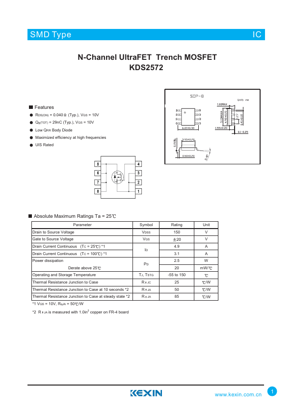 Derate above 25 Operating and Storage Temperature Thermal Resistance Junction to Case Thermal Resistance Junction to Case at 10 seconds *2 Thermal Resistance Junction to Case at steady state *2 *1 VGS = 10V, RqJA = 50 /W *2 R JA is measured with 1.0in2 copper on FR-4 board
