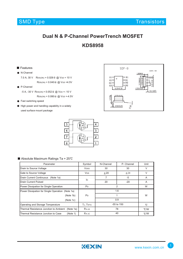 Dual N & P-Channel PowerTrench MOSFET KDS8958