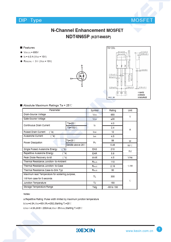 DIP Type N-Channel Enhancement MOSFET NDT4N65P (KDT4N65P) MOSFET Ƶ Features ƽ VDS (V) = 650V ƽ ID = .0 A (VGS = 10V) ƽ RDS(ON) ˘ 3¡ (VGS = 10V) 72 D 1 23 G S  Ƶ Absolute Maximum Ratings Ta = 25ć Parameter Drain-Source Voltage Gate-Source Voltage Continuous Drain Current Pulsed Drain Current Avalanche Current ( *a) ( *a) Ta=25ć Ta=100ć Power Dissipation Single Pulsed Avalanche Energy Ta=25ć Derate above 25ć ( *b) Repetitive Avalanche Energy ( *a) Peak Diode Recovery dv/dt ( *c) Thermal Resistance.Junction- to-Ambient Thermal Resistance.Junction- to-Case Thermal Resistance.