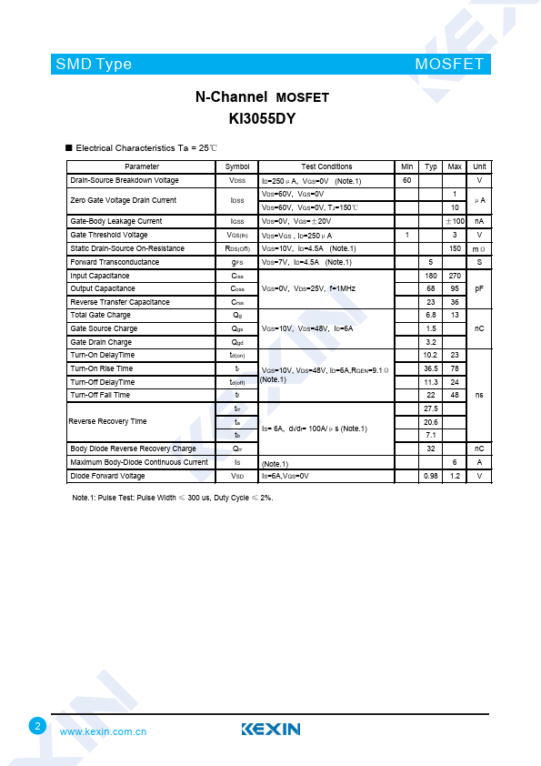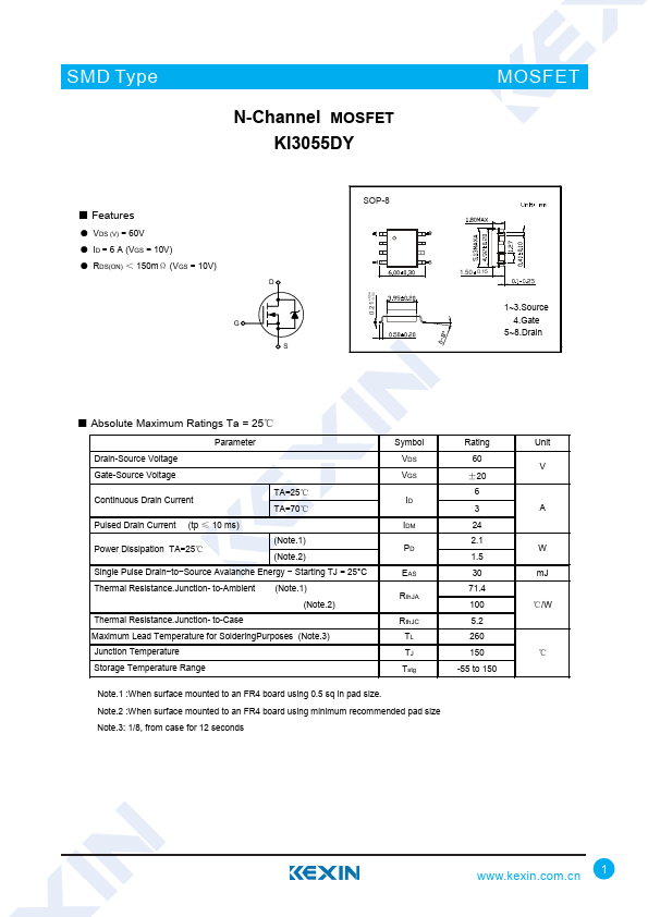 ● VDS (V) = 60V ● ID = 6 A (VGS = 10V) ● RDS(ON) < 150mΩ (VGS = 10V)