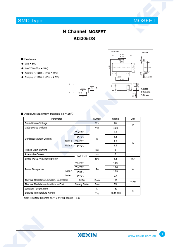 ● VDS = 60V ● ID = 2.3 A (VGS = 10V) ● RDS(ON) < 156mΩ (VGS = 10V) ● RDS(ON) < 192mΩ (VGS = 4.5V)
