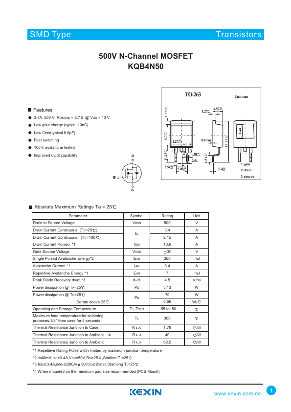 3.4A, 500 V. RDS(ON) = 2.7 @ VGS = 10 V Low gate charge (typical 10nC) Low Crss(typical 6.0pF) Fast switching 100% avalanche tested lmproved dv/dt capability