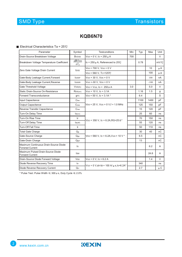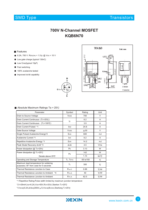 6.2A, 700 V. RDS(ON) = 1.5 @ VGS = 10 V Low gate charge (typical 130nC) Low Crss(typical 15pF) Fast switching 100% avalanche tested lmproved dv/dt capability
