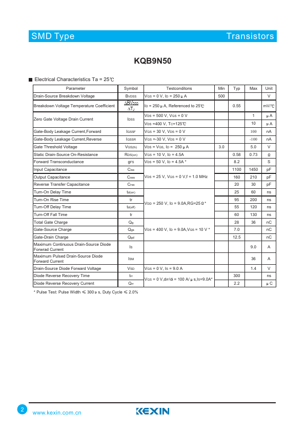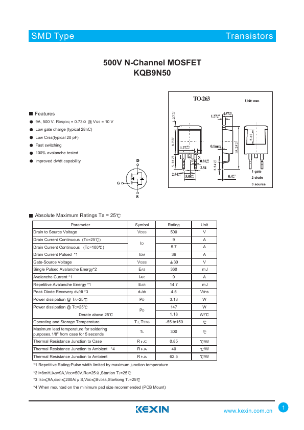9A, 500 V. RDS(ON) = 0.73 @ VGS = 10 V Low gate charge (typical 28nC) Low Crss(typical 20 pF) Fast switching 100% avalanche tested lmproved dv/dt capability