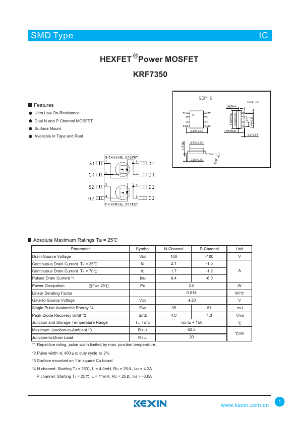 Ultra Low On-Resistance Dual N and P Channel MOSFET Surface Mount Available in Tape and Reel