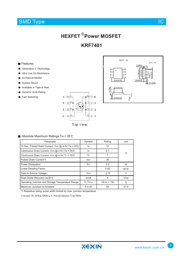 Generation V Technology Ultra Low On-Resistance N-Channel Mosfet Surface Mount Available in Tape & Reel Dynamic dv/dt Rating Fast Switching