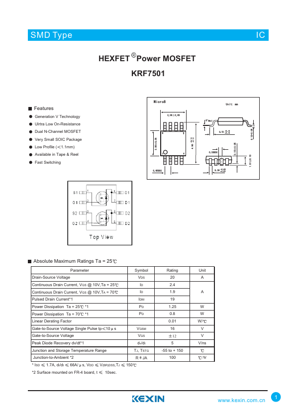 Parameter Drain-Source Voltage Continuous Drain Current, VGS @ 10V,Ta = 25 Continuous Drain Current, VGS @ 10V,TA = 70 Pulsed Drain Current*1 Power Dissipation Ta = 25 *1 Power Dissipation Ta = 70 *1 Linear Derating Factor Gate-to-Source Voltage Single Pulse tp 10 s Gate-to-Source Voltage Peak Diode Recovery dv/dt*1 Junction and Storage Temperature Range Junction-to-Ambient *2 * ISD 1.7A, di/dt 66A/ s, VDD V(BR)DSS,TJ *2 Surface mounted on FR-4 board, t 10sec.