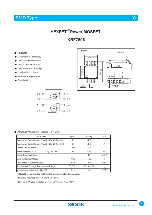 Generation V Technology Ultra Low On-Resistance Dual P-Channel MOSFET Very Small SOIC Package Low Profile ( 1.1mm) Available in Tape & Reel Fast Switching