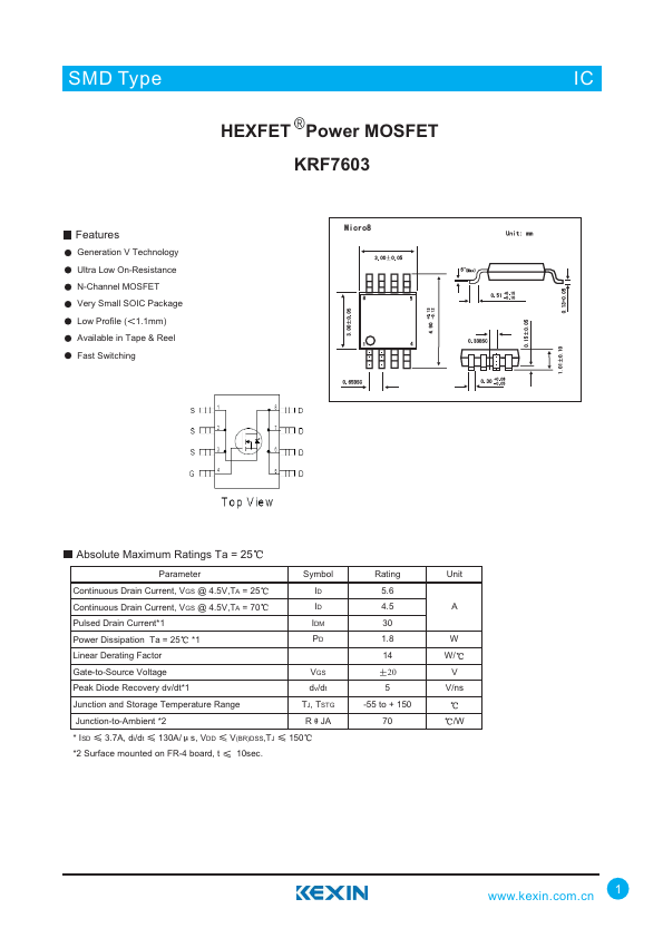 Generation V Technology Ultra Low On-Resistance N-Channel MOSFET Very Small SOIC Package Low Profile ( 1.1mm) Available in Tape & Reel Fast Switching