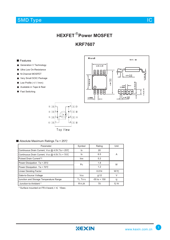 Generation V Technology Ultra Low On-Resistance N-Channel MOSFET Very Small SOIC Package Low Profile ( 1.1mm) Available in Tape & Reel Fast Switching