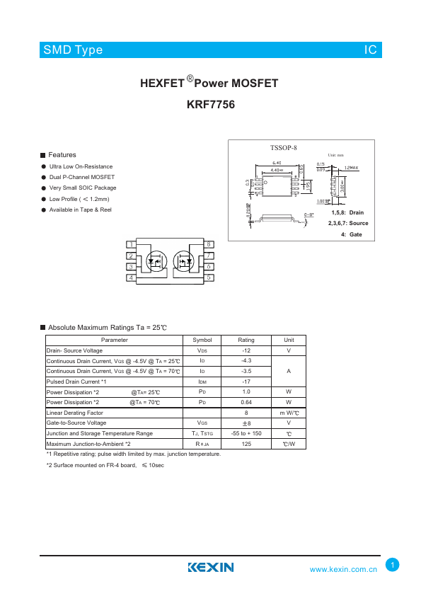 Ultra Low On-Resistance Dual P-Channel MOSFET Very Small SOIC Package Low Profile ( 1.2mm) Available in Tape & Reel