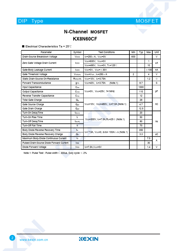 ● VDS (V) = 600V ● ID = 7.5 A (VGS = 10V) ● RDS(ON) < 1.2 Ω (VGS = 10V) ● Fast switching ● Improved dv/dt capability
