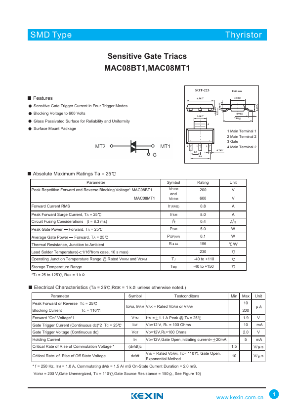 Parameter Peak Repetitive Forward and Reverse Blocking Voltage* MAC08BT1