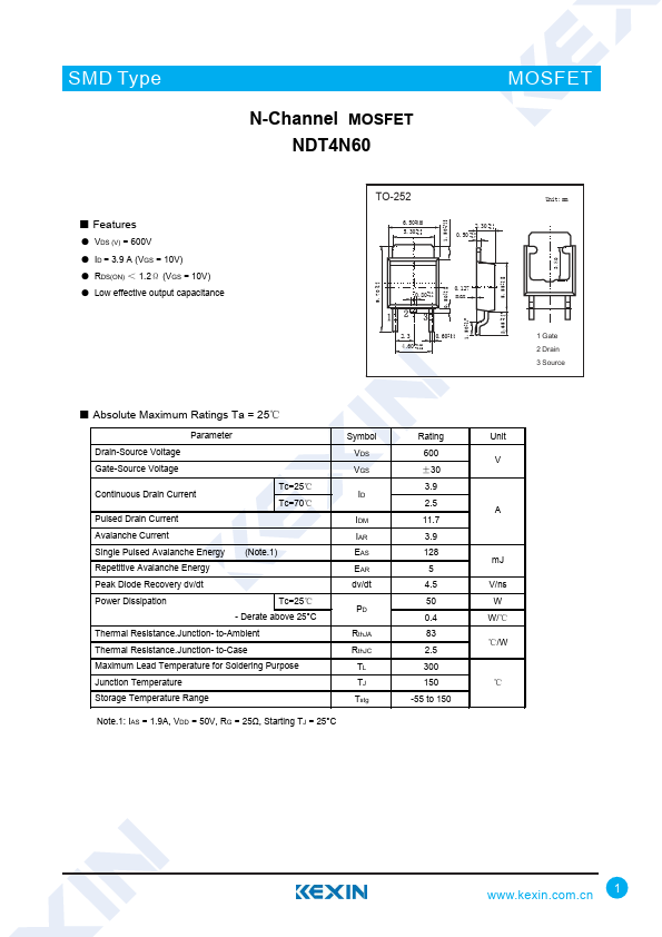 ● VDS (V) = 600V ● ID = 3.9 A (VGS = 10V) ● RDS(ON) < 1.2Ω (VGS = 10V) ● Low effective output capacitance